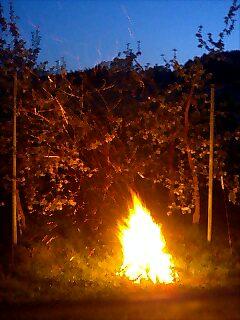 1℃まで下がったので、昨日用意しておいた焚き木を果樹園で燃やしました。