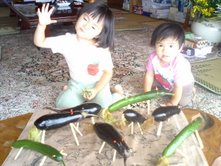 キュウリとナス、楊枝とマッチで、娘たちと作りました。