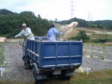 ダンプから、雪かきスコップで撒いている様子です。